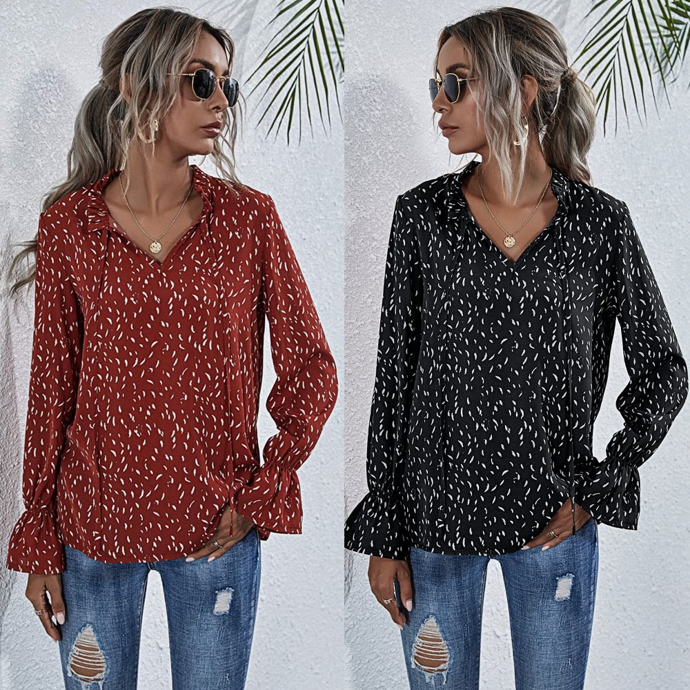 Amazon Independent Station Popular Printed Lotus Leaf V Neck Lace-up Long-sleeved Top 2292